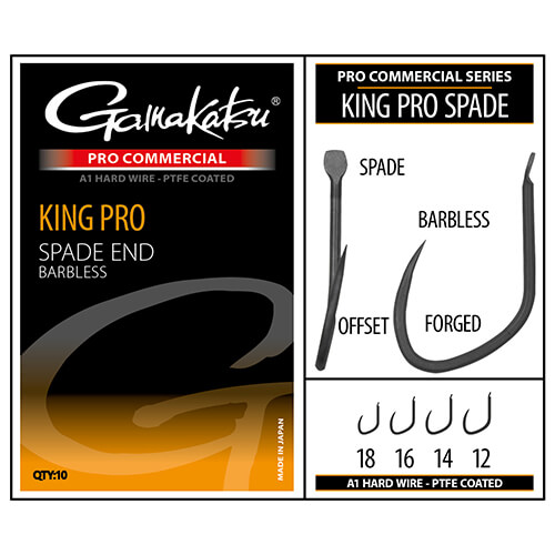 Das King Pro Spade End basiert auf dem originalen Gamakatsu 2210 Modell, das in ganz Europa für seinen großartigen Hakenhalt dank der versetzten und gebogenen Spitze bekannt ist. Diese widerhakenlose Version aus A1-Draht macht da keine Ausnahme. Vor allem, wenn der Hakenköder etwas zu tief an der Rute oder mit einem langen Schwanz bei der Feeder-Taktik präsentiert werden soll, wird dieses Modell von vielen Top-Anglern bevorzugt. Dieses mittelschwere Drahtmuster ermöglicht eine sehr sensible Köderpräsentation und dank des geschmiedeten Stahls wurde eine zusätzliche Kraft hinzugefügt. Die P.T.F.E.-Beschichtung verbessert die Durchschlagskraft und hält die Spitze extrem scharf. Das King Pro Spade End kann sowohl an der Angelrute als auch am Feeder verwendet werden, um Brassen, Schleien, F1's und Karpfen in Wettkampfgröße zu fangen.