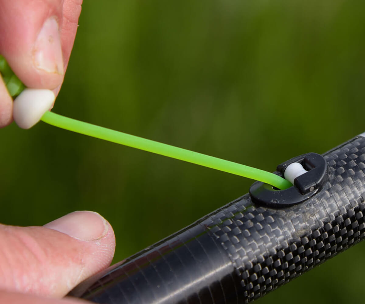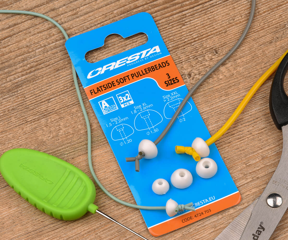 The Flatside Soft Pullerbeads are made from solid elastic-friendly rubber and feature a tapered hole. The bead clamps nicely on the (hollow) elastic, which can be adjusted to change the tension to your preference. The back of the bead is flattened to fit perfectly against the puller slot without protruding. The soft material prevents the bead from rattling against the pole.