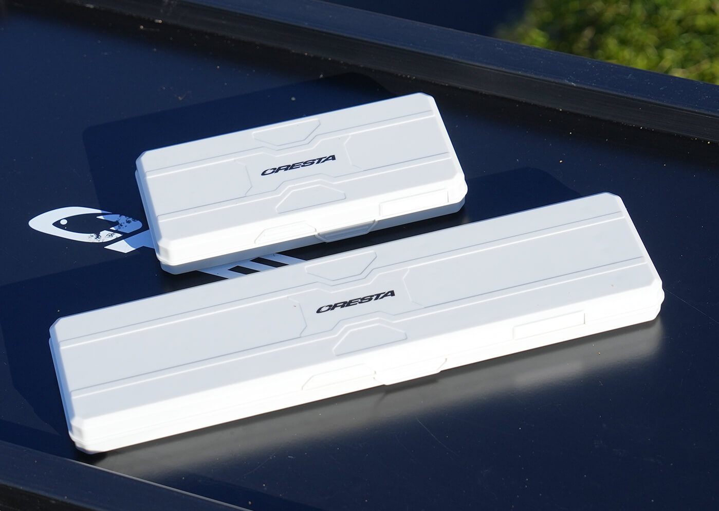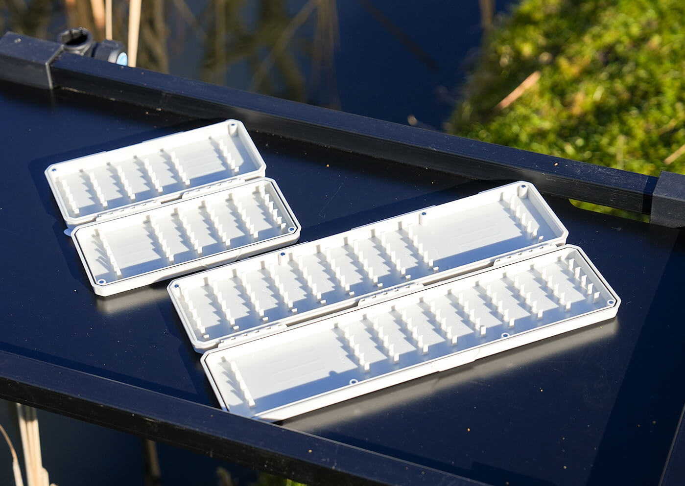 The Magna Rig Box is specially designed for the safe and organized storage of rigs, offering maximum protection thanks to its tough ABS material and durable metal-pinned hinges. The built-in magnetic closures make opening and closing easy, while the rubber-sealed seam keeps moisture out. Sturdy pins allow rigs to be neatly secured with or without a hair, and the light grey interior provides excellent visibility of hooks and lines. The 6’’ version holds up to 11 rigs ranging from 5 to 15 cm, while the 12’’ version accommodates 11 rigs from 10 to 30 cm. Thanks to its compact design, the Magna Rig Box is easy to carry and store.