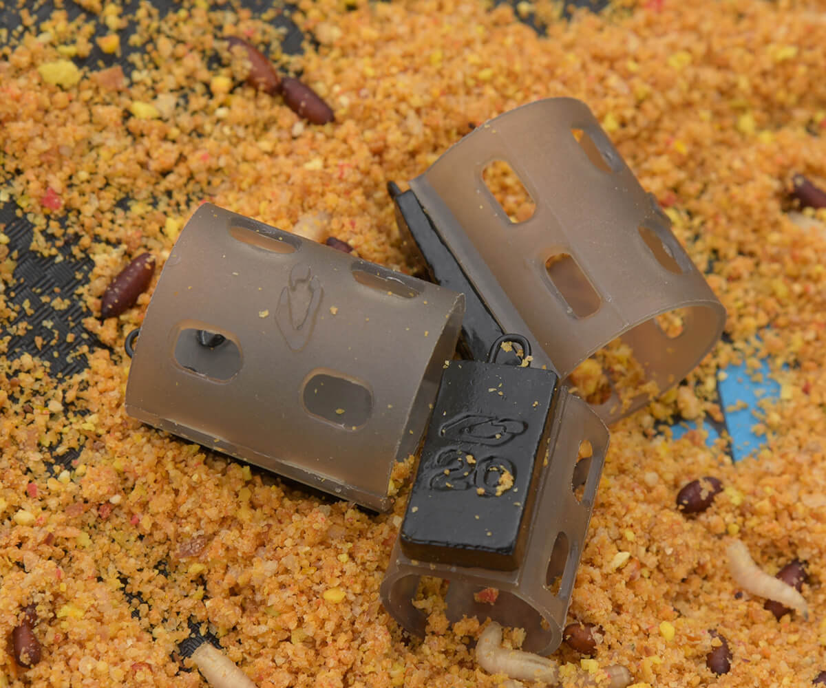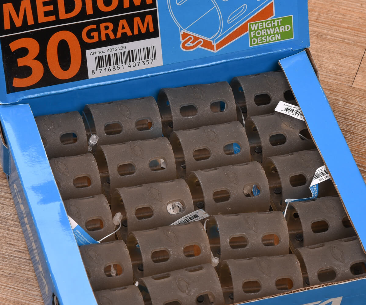 Thanks to its closed design, this Plastic Open End Feeder guarantees minimal bait release while sinking through the water and landing, so that a compact feeding spot can be built up. The tapered shape of the weight with the center of gravity pointing downwards ensures the feeders cast very well. A robust metal eye is molded within the weight. The Plastic Cage Feeders are available in Small, Medium and Large.