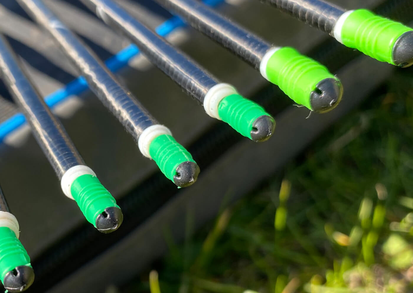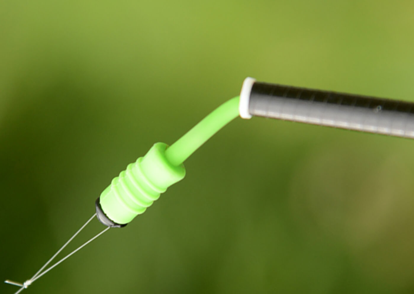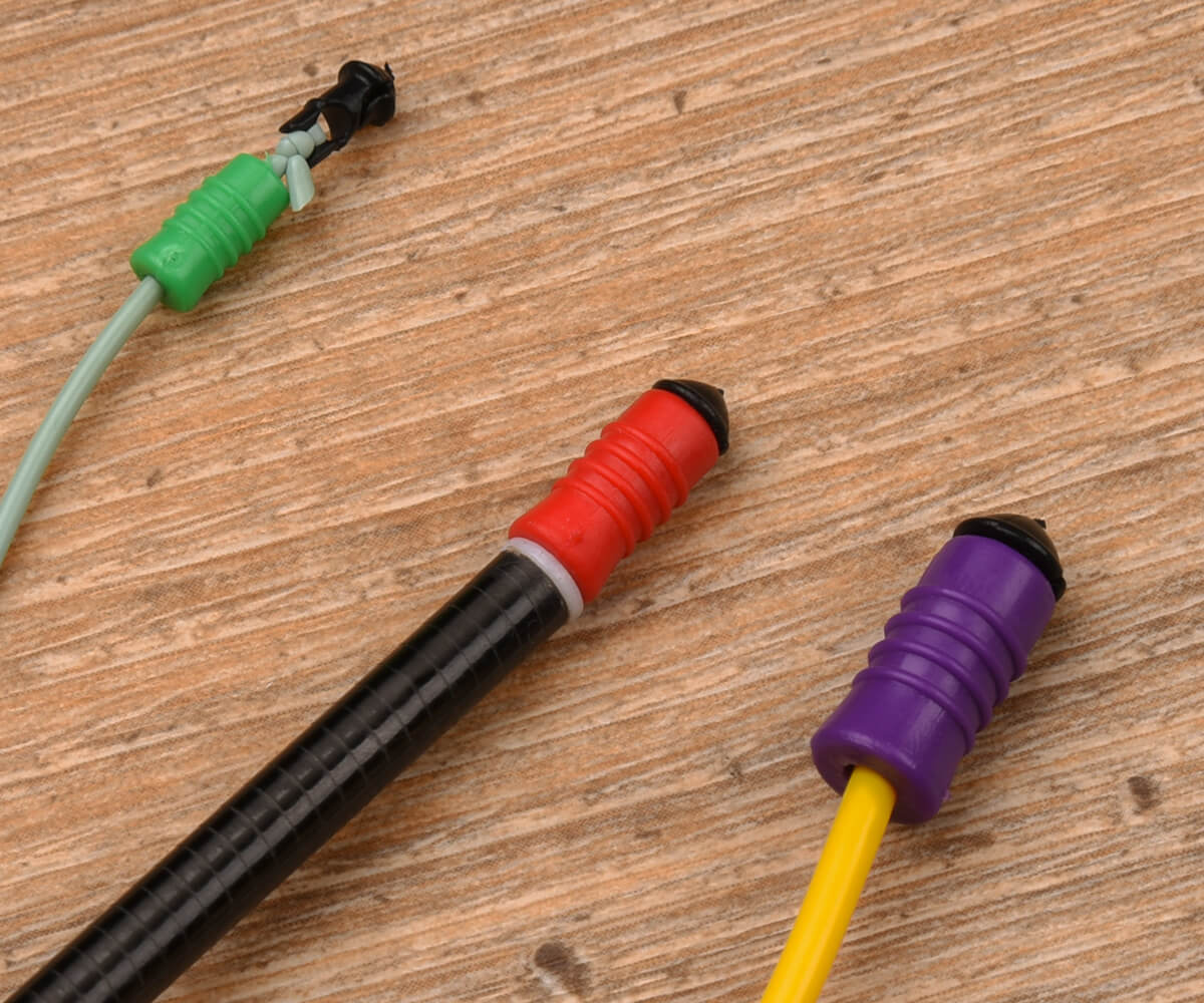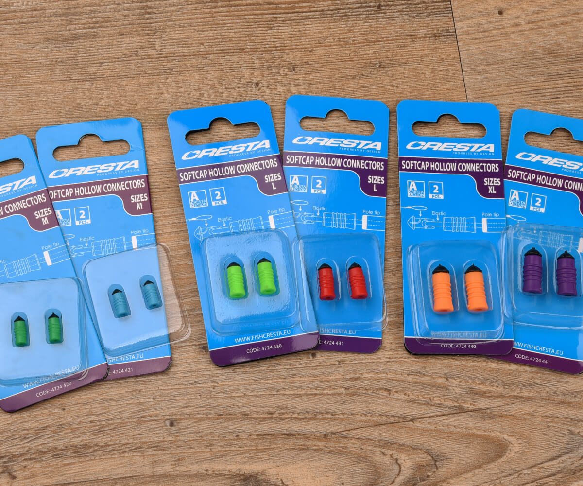 The Softcap Hollow Connectors form a compact and highly reliable connection between the rig and pole elastic. The hard insert section has a notch on the front for fixing the main line. The back has a round opening for mounting the elastic. The soft cap features sufficient space for the knot and has ridges on the outside for additional grip. To lock the connector, slide the cap over the notch against the head of the insert. The rubber cap prevents damaging the elastic and reduces the noise when hitting the pole while the flat underside sits flat against the tip.