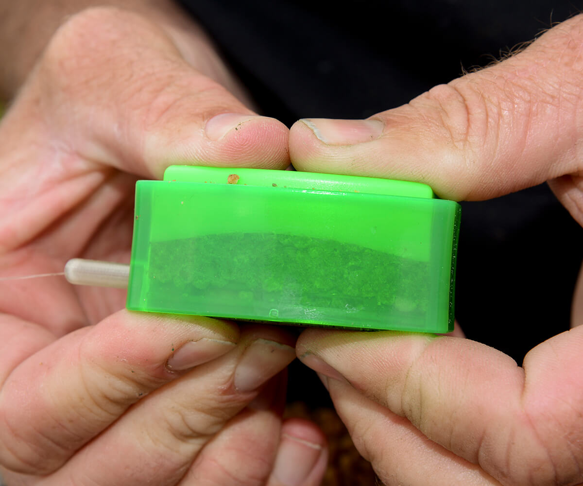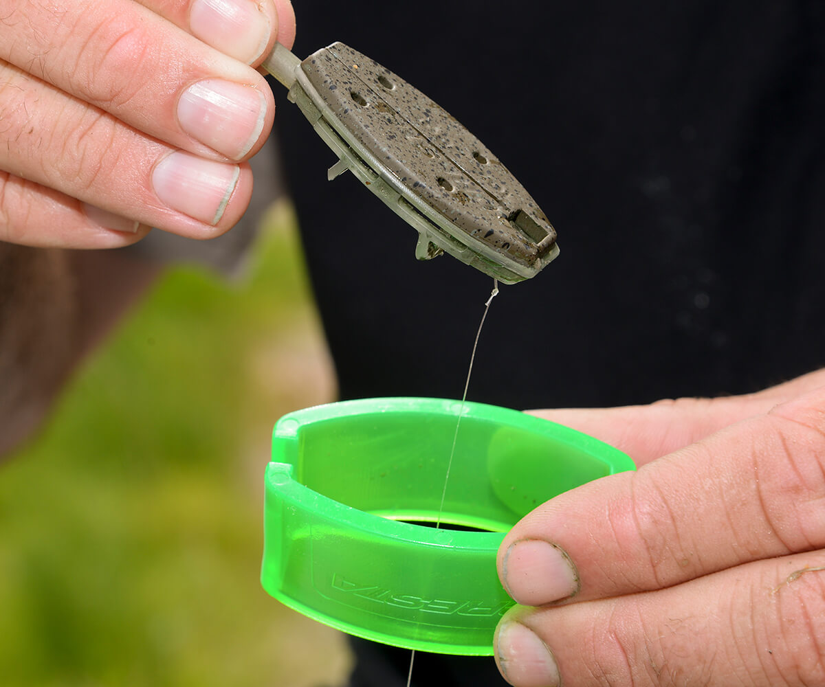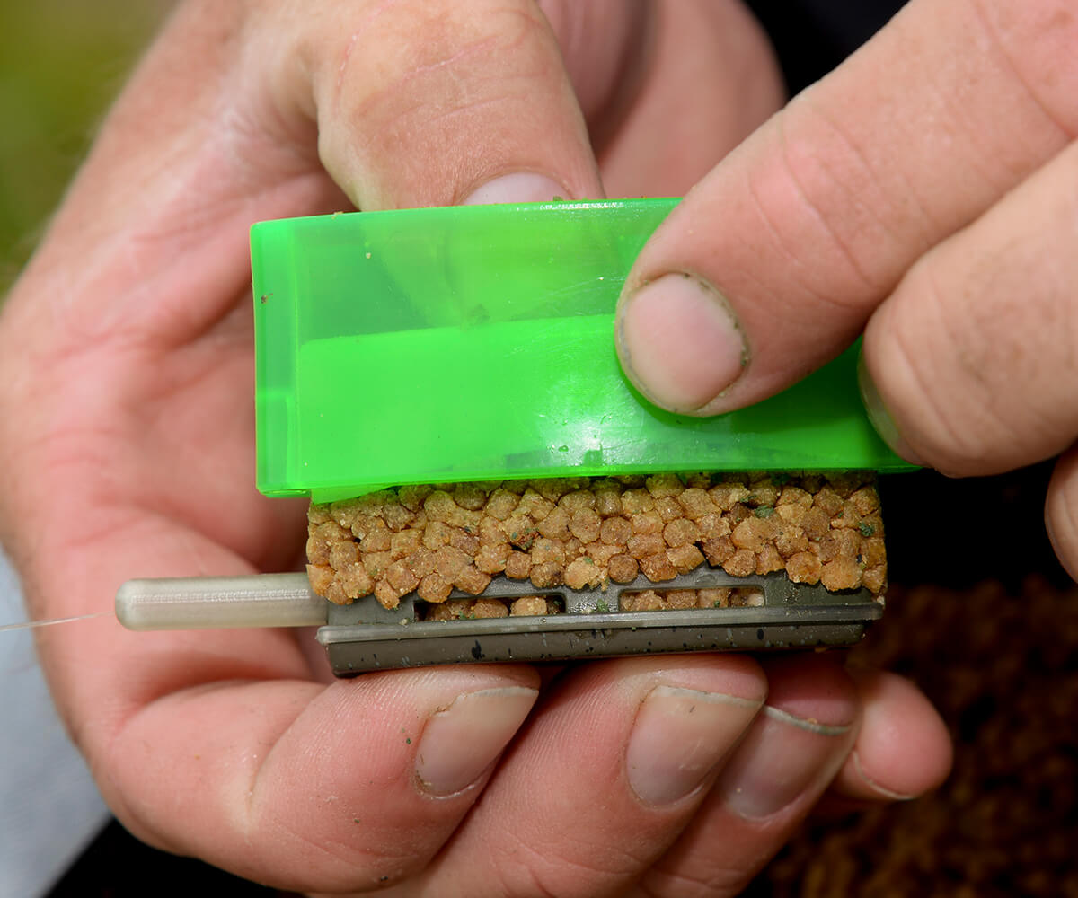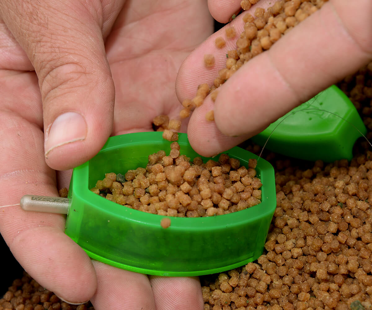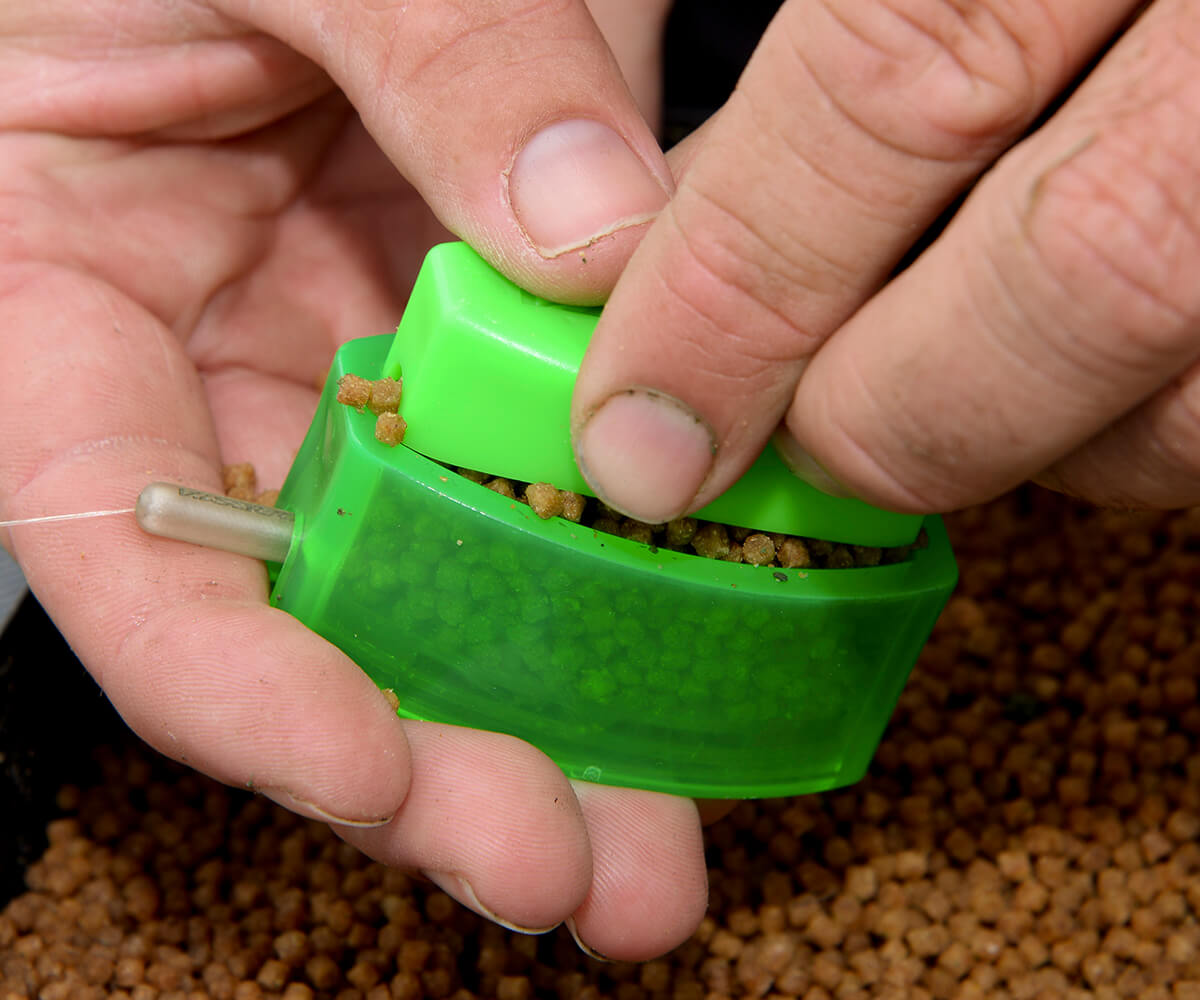 This in-house designed Method Mould makes it extremely easy to refill your method feeders rapidly. Simply put the ring over the feeder and fill it with ground bait. Add the stamp and compress the bait. Push the stamp through the ring until the filled feeder comes out on the bottom. This mould can be used for both micro pellets and groundbait.